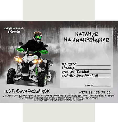 Мы предлагаем незабываемые приключения на квадроциклах в живописном лесном массиве под Минском.Наша команда — это профессионалы, которые обеспечат вас качественной техникой, экипировкой и инструктажем. У нас есть маршруты для новичков и опытных райдеров, а после заезда вы можете отдохнуть в мангальной зоне. Доверьтесь нам — и получите максимум эмоций! |